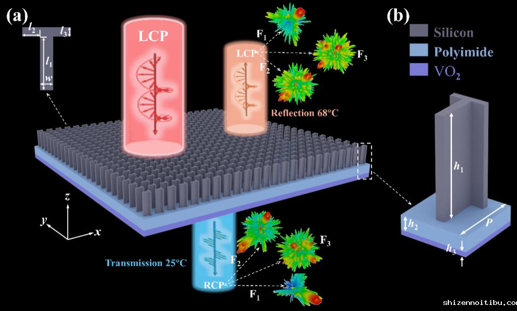 广义编码序列之间的卷积和叠加有助于轨道角动量(OAM)涡旋光束的精准调控,以及精确操纵光子传播特性。这一现象显著提升通信容量与成像分辨率,展现出在智能通信、太赫兹成像等领域具有广泛的应用潜力。二氧化钒(VO2),作为一种温控相控材料,有效控制编码超表面透射-反射模式的动态切换,实现涡旋光束在0到360°范围内的连续精准调控。