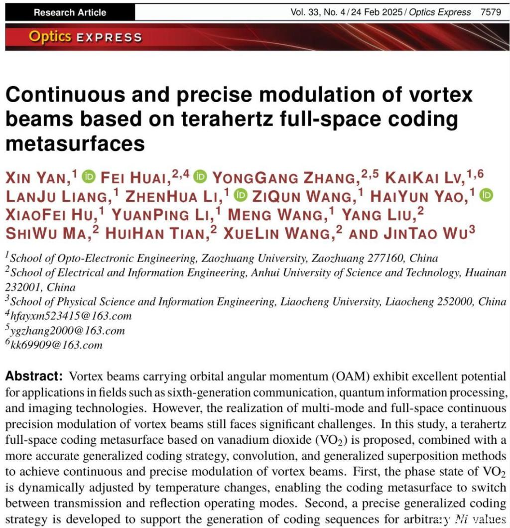 近日,我校kaiyun体育官网入口网页版太赫兹团队闫昕教授以“Continuous and precise modulation of vortex beams based on terahertz full-space coding”为题在《Optics Express》发表最新研究成果。该成果设计了一种基于太赫兹全空间编码超表面的选择性高容量智能通信和高分辨率成像平台。